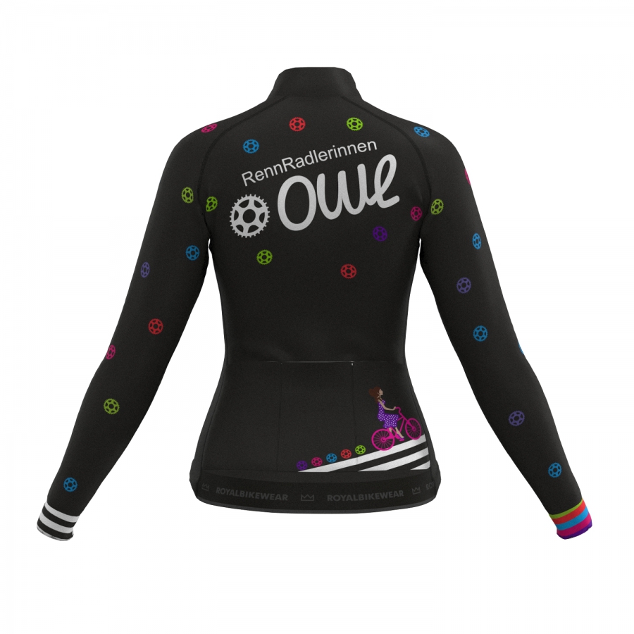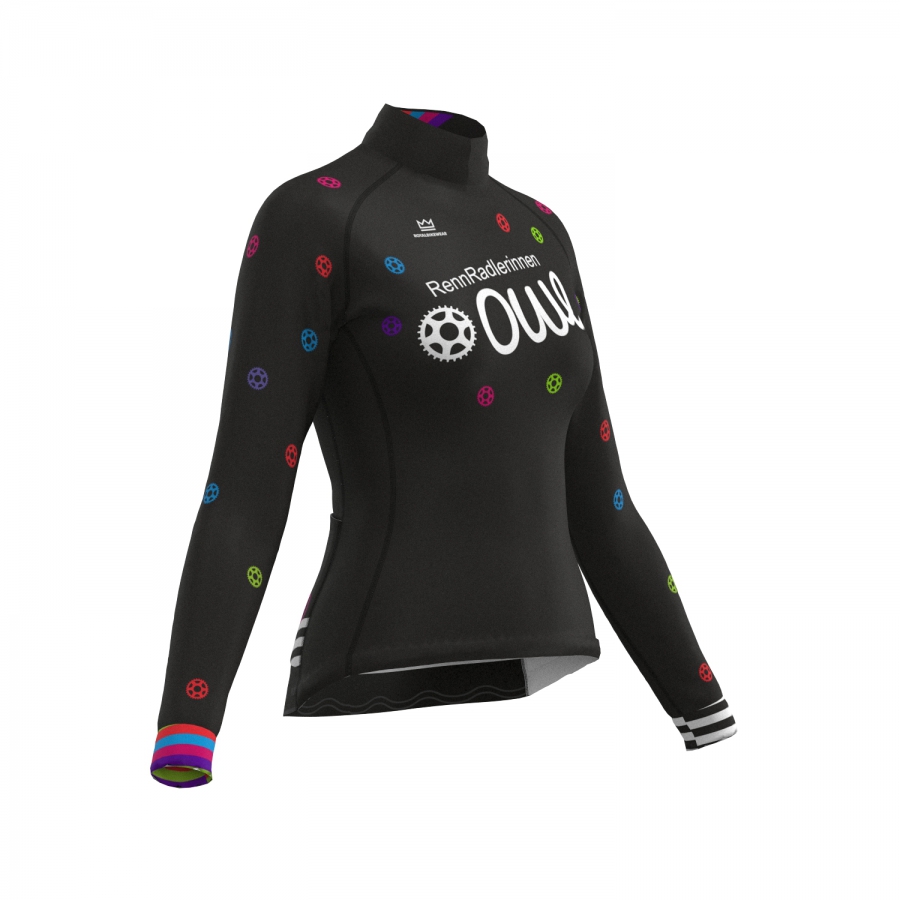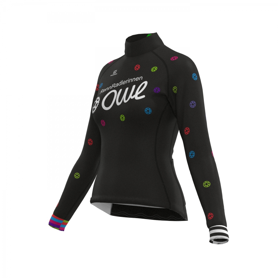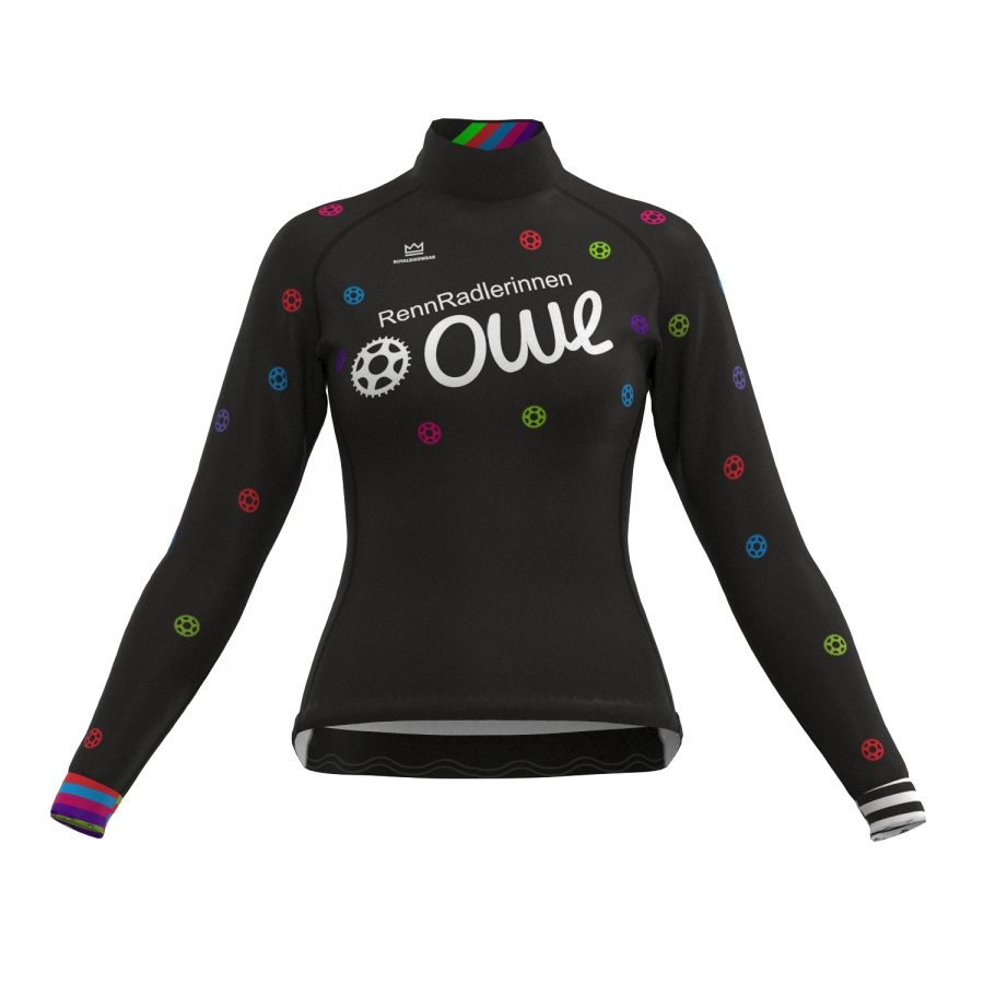Die Frauenlangarmtrikots sind kürzer, enger und mit stärkerer Taillierung geschnitten als die Männervarianten. So lassen sie den weiblichen Körper optimal zur Geltung kommen.Es gibt sie in den gleichen Stoffen wie die Männertrikots. Sowohl 2nd-Layer als auch Superroubaix sind angeraut und haben eine bessere Wärmeisolierung als die Kurzarmtrikotstoffe.Die Langarmtrikots werden mit Flachnähten und optional mit gewebten Spezialabschlüssen an der Rückseite gefertigt. Die Reißverschlüsse können wahlweise verdeckt produziert werden. Die Arme schließen mit eleganten Bündchen ab.