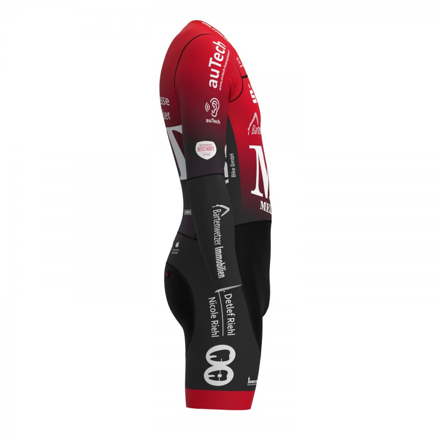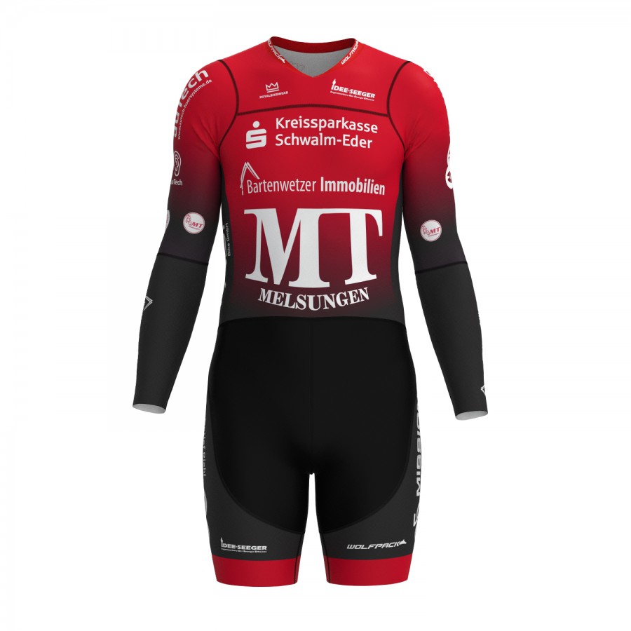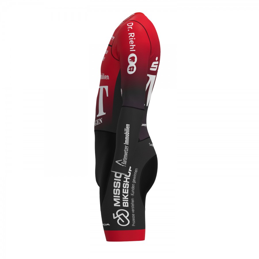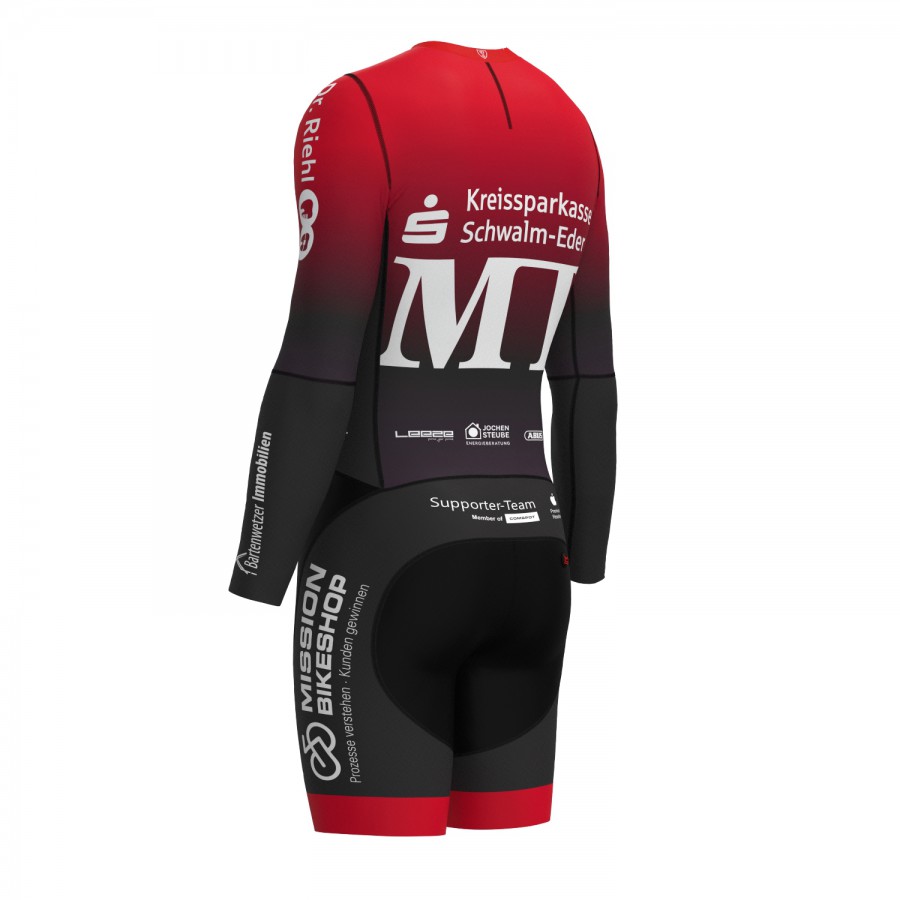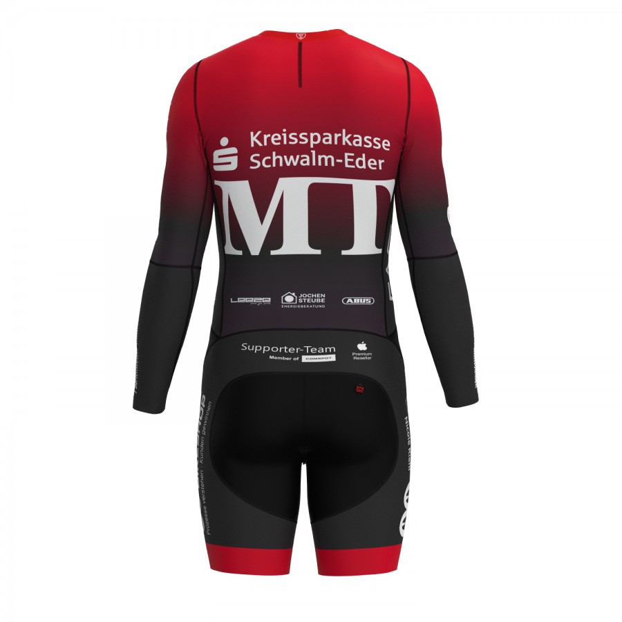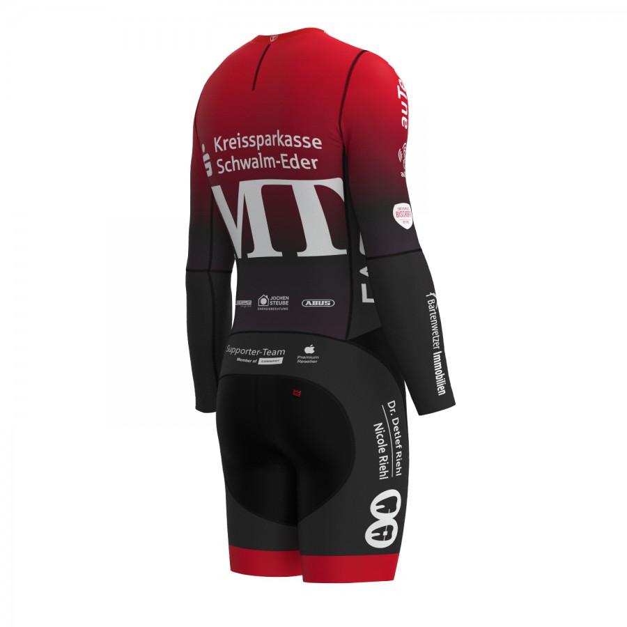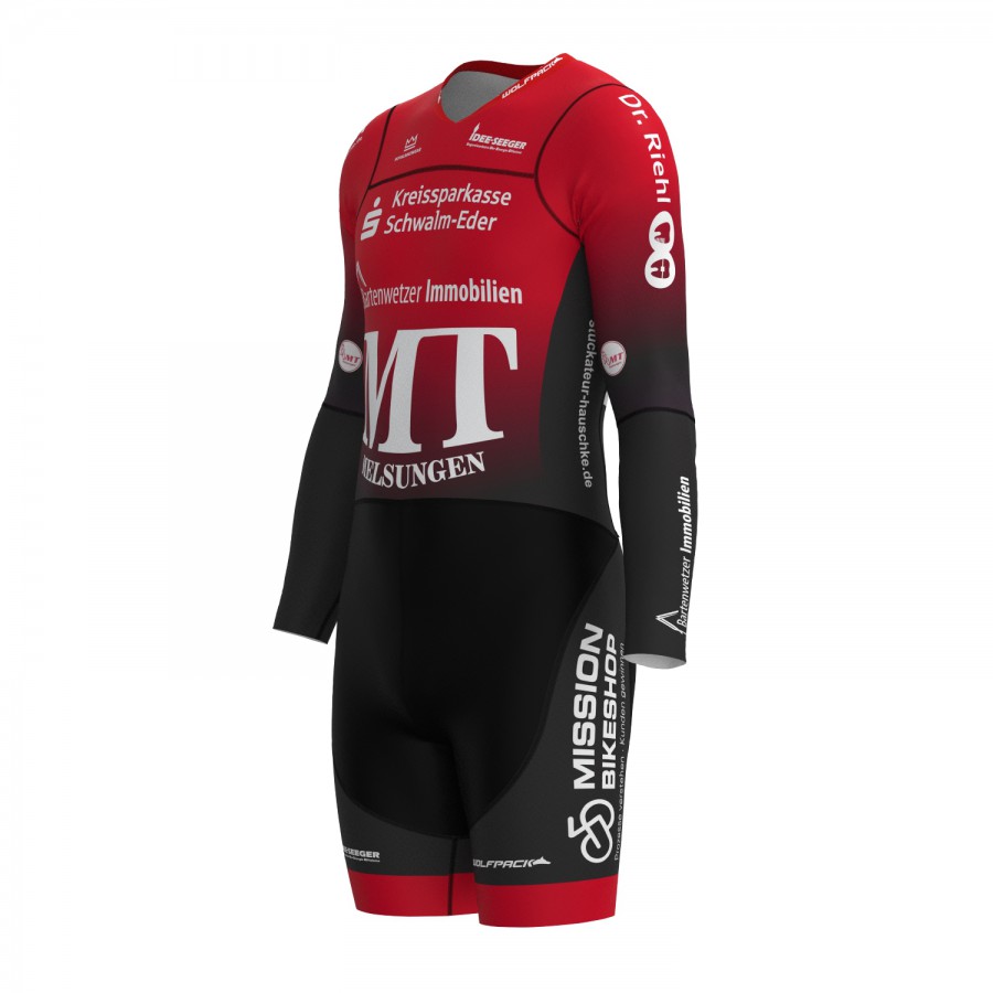 Der Wingsuit ist kompromisslos auf Aerodynamik optimiert. Der Anzug ist radikal auf die Sitzposition auf dem Zeitfahrrad angepasst und verfügt z.B. über eine sehr kurze Vorderseite, die eine aufrechte Position kaum ermöglichen. Insgesamt verwenden wir fünf verschiedene Stoffe. Eine Bahn verläuft nahtlos von der Brust über die Schultern auf den Rücken, hier verwenden wir einen Stoff mit Kanälen, um die Luft optimal abzuleiten. An den Oberarmen und äußeren Schultern kommt ein Meshstoff mit einer rauen Struktur zum Einsatz, um die Luft zu verwirbeln. An dieser exponierten Stelle ist es aerodynamisch vorteilhaft, wenn der Luftstrom wie bei einem Golfball gebrochen wird um den "Drag" zu reduzieren.Die Bein- und Armenden schließen nahtlos mit einer durchgehenden 5mm breiten innenliegenden Silikonlinie ab, die einen bombenfesten Sitz garantieren.